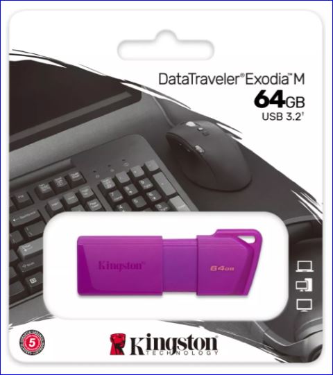 DataTraveler Exodia M de Kingston ofrece un rendimiento USB 3.2 Gen 1 para un fácil acceso a computadoras portátiles, computadoras de escritorio, monitores y otros dispositivos digitales DT Exodia M permite transferencias rápidas y almacenamiento conveniente de documentos, música, videos y más. Está disponible en múltiples opciones de colores elegantes que corresponden a capacidades de hasta 256 GB. Su practico diseño lo convierte en una solución de almacenamiento ideal para llevar, ya sea en el trabajo, el hogar o la escuela. El DT Exodia M está respaldado por cinco años de garantía, soporte técnico gratuito y la legendaria confiabilidad de Kingston.